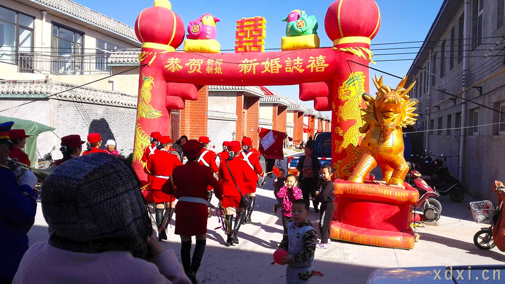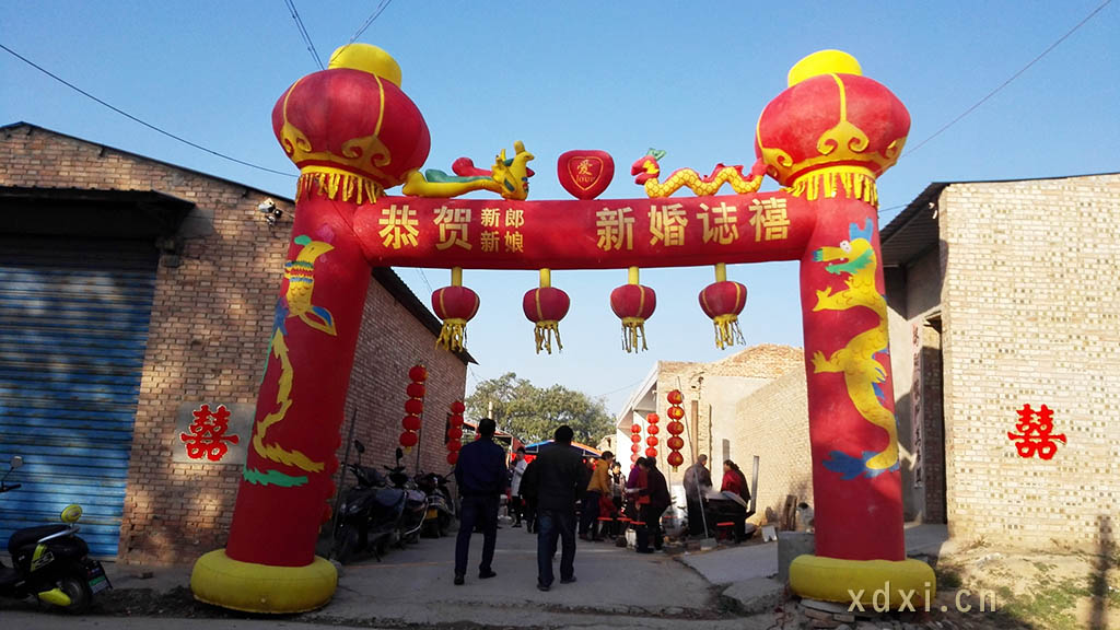 “囍”字,更多地用于婚嫁場(chǎng)合渲染氣氛。囍為兩個(gè)喜字相合,含有夫妻恩愛(ài)、天長(zhǎng)地久之意,囍字自然就成為婚姻的代名詞。在傳統(tǒng)婚俗中,迎親之日,男女雙方各在自家門(mén)、街門(mén)粘貼大紅囍字,在新婚喜居的街門(mén)道口安置大型紅色拱門(mén),門(mén)頭上有“新婚誌禧”,赫然醒目。