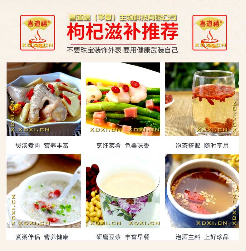 作為藥膳原料時,枸杞的食用技法很多,既可單獨食,又可與其它原料配合使用,做成各種具有不同功效羹、湯、粥、膏、餅、點、菜品等。精品枸杞藥膳,可見本站:"養生中心”/“養生藥膳"。