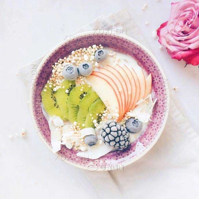 4、將紫色或粉紅色葡萄粒(或1小串)、蘋果片、獼猴桃片、大米爆米花或薏米爆米花少許、樹莓或草莓依次有序地輕馥在粘稠枸杞多肽汁的上面,拼花爭(zhēng)妍,精致靚麗,留香溢彩,拍個(gè)靚照發(fā)朋友圈。